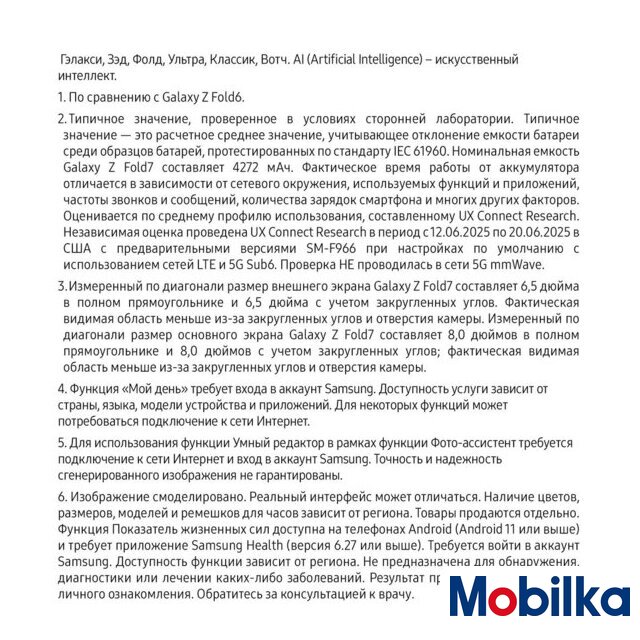 | Отличия от предыдущего поколения | ✅ В Galaxy Z Fold7 реализовано несколько инноваций, которые отличают его не только от Galaxy Z Fold6, но и от любого другого складного смартфона на рынке. Во-первых, широкие дисплеи как внутри, так и снаружи. Диагональ внешнего экрана теперь составляет 6.5 дюйма, а основной экран имеет впечатляющую диагональ 8 дюймов с более широким соотношением сторон, что обеспечивает более плавную работу в многозадачном режиме.✅ И хотя дисплеи стали больше, сам смартфон значительно уменьшился в размерах и стал более портативным, чем все предыдущие Galaxy Z Fold, как в сложенном, так и в раскрытом виде. В раскрытом виде его толщина составляет 4.2 мм, а в сложенном — 8.9 мм, что делает его примерно на 25% тоньше Galaxy Z Fold6.✅ В сложенном состоянии экран Galaxy Z Fold7 имеет соотношение сторон 21:9, аналогичное соотношению сторон у премиальных смартфонов моноблокового типа. Такое улучшенное соотношение сторон обеспечивает удобство и естественность набора текста, а также повышает производительность. |